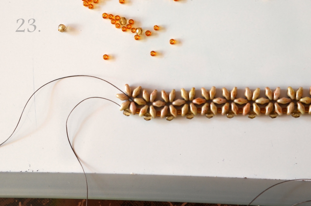 Powtarzamy całą operację nawlekania pomiędzy koraliki Superduo koralików Fire Polish na zmianę z koralikami TOHO.